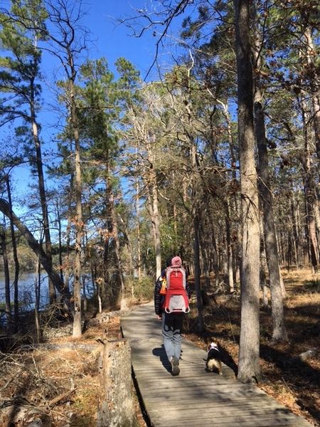 週末、一日だけ晴れたので、犬も連れて、Stephen F. Austin州立公園に出かけました。ここの見どころは、シカ、キツツキとフクロウらしい。今日は、洪水しているのかな、3本のトレイルしか開いてないよとのことで、そのうちの2つを歩いてみました。