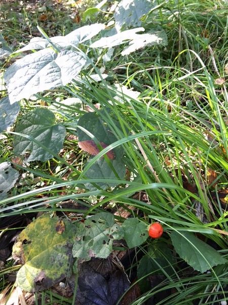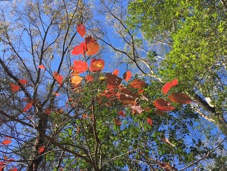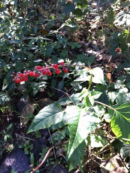 トレイルでは、赤い花や実が目につきました。紅葉はなくて、青々としてました~。