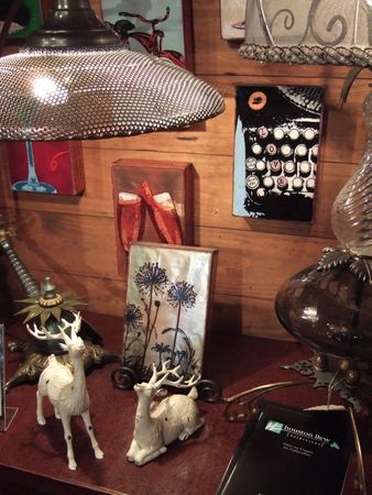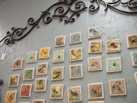 手前のシカじゃなくて、銅の上にガラスを溶かして絵を描いたアートの方。壁一面にいろんな絵が飾られてて、みてるだけで楽しかった。店の奥には、レンガに描いたのもあって、素材が違うとまた風合いが違って面白かった(↓)。