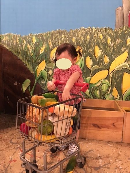 お買い物カートも大好き。先ほどのキッチンとお店でお買い物を山ほどしてきて、このコーンフィールドでとうもろこしをわんさか抜きました^^