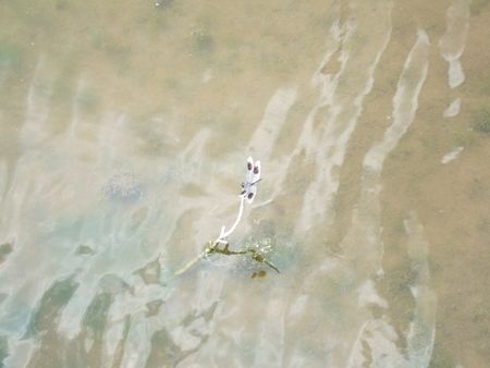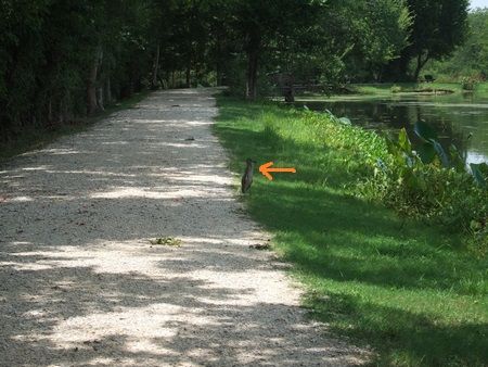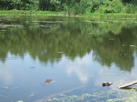 この日は暑くて、もうお昼だし・・で、ワニはみんな水のなか。もう見れないのかと半ば諦めつつ池の周りをお散歩していると、とあるデッキの近くで泡がぶくぶくしてました。なにこれ~?って観てると、ワニの顔がぽかっと浮かんできました。わーわー言っても、ワニ動じず。1分くらいすると、またしずか~に沈んで行きました。もう少し進んだ場所でも泡の後にワニが(↓)。案外、歩道のすぐ近くに沈んでるんだな~。ぴこぴこハンマーで叩きたくなる(笑)。あきらかに不自然な泡で探す作戦、おすすめです。