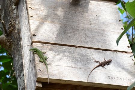 途中、コウモリのための巣箱には、グリーンアノールがいました。