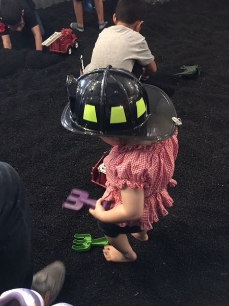 消防車にはひとまず乗った程度だったけど、タイヤのゴムを粉砕したようなゴムの砂場でも長いこと遊びました。最初、足での感触にびっくりしたようすだったけど、そのうち車に砂(ゴム)をスコップでのせたりして、遊び始めました。しまいには、消防車用のヘルメットまで被っていました。