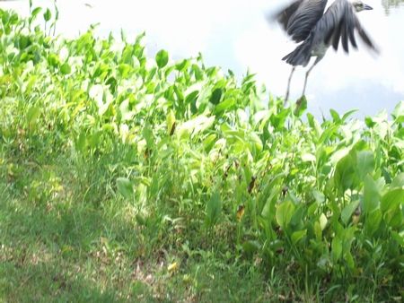 水辺には、水鳥がわんさかいました。ミノゴイ、バン、アマサギ、ミゾゴイ、アカハシリュウキュウガモ、シロトキ(野生のトキの仲間ははじめてみました!)・・・Anhingaという日本語名のわからないウの仲間もいました。こちら再び登場のミノゴイさん。ザリガニかなにかを咥えて道端にいました。わたしたちが近づくとあわてて飲み込みました。喉にあるそのうがぱんぱんです(↓)。