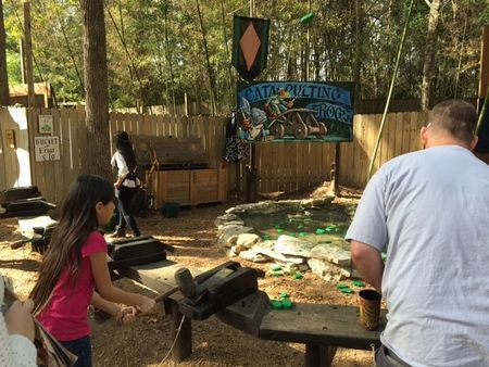日本のお祭りの出店みたいに、ナイフ、ハンマーなどを使った射的、アヒル人形すくい、梯子から落ちずに鐘を鳴らす、大きなブランコ、、、、などなど、やってみたらついつい大人もハマってしまいそうなお店もたくさん。写真は、ハンマーで叩いて、木製カエルを池ぽちゃさせるゲーム。古きよき的な??