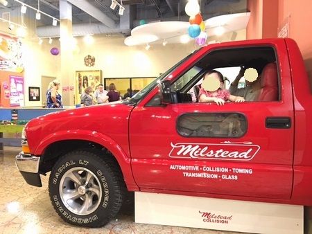 乗り物があれば、とりあえず乗りたいみたい。運転席に乗ってもそれほどハンドルを回さず。とりあえず乗って、ボタンとかを押していじりたい。赤いピックアップトラックのエンジンルームがアクリル板でみえるようにしてありました~。