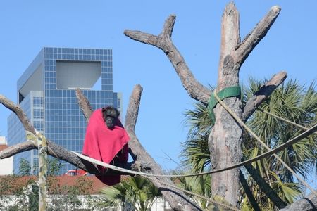 都会に出てきた風来坊的な風情のチンパンジー。ビルとの対比がなんとも。