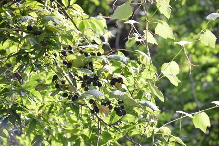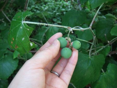 夫が木にブドウみたいな蔓がからまってるのを発見。目が慣れると、蔓はあちこちの木にからみついて実ってました。まだ固かったけど、マスカットの粒くらいある~(↓)。熟したら何色になるんだろ~