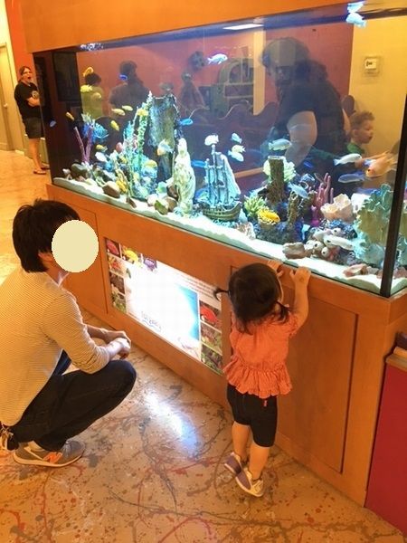 世界に分布するお魚が水槽で泳いでいました。魚の手話をして「おさなな(おさかな)」といって指さしていました。