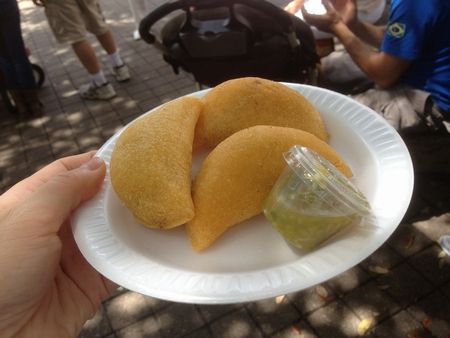 ランチには、中南米のどっかの国(忘れた><)の出店のサモサ系のを食べた(↓)。緑のソースはパラペーニョなのかめちゃ辛かったけど、ついついつけちゃう。