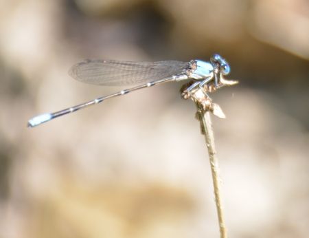 小さな青いトンボもいたよ。ちょっとピンボケぎみですが、Blue-fronted Dancer かな~?往復で1kmくらい歩いて、犬も娘も大人もいい汗かきました。気持ちよか!