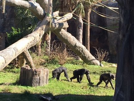 なぜか三匹並んで行進していたチンパンジー。