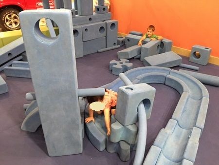 発泡スチロールみたいな柔らか硬い素材のブロック。夫が線路のように並べたら、何人かの子供がやってきて、みんな娘のように線路(?)の上を歩いていたのが面白かった。