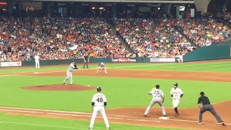 27番のAltuve選手が好きなので、彼がバッターのときは特に楽しかった。Altuveが盗塁しないようにけん制したときの写真。