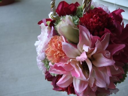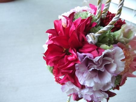 ブーケは、どの方向が正面になってもきれいなようにお花が配置されていて、しかも主役のお花のピンクの色あいが少しずつ違うので、いろんな角度から楽しめます。たとえば、こんな風に(↓)。お母さんの作るパッチワークのパタンもいつもすごく考えられていて、近くでみれば生地の組み合わせが、遠くからみればグラデーションが美しいんだけど、このブーケにもお母さんの個性がきらりと光っているなと思いました。