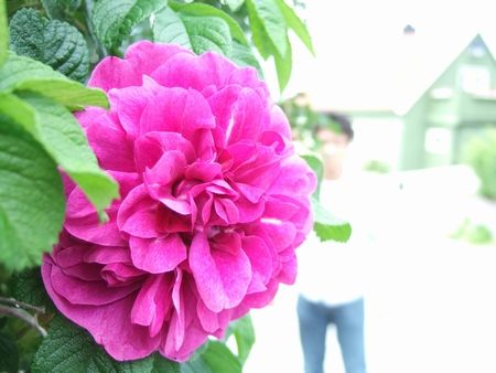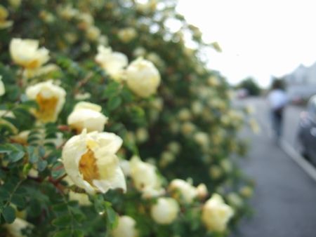 お散歩中に、白い花が咲く生け垣からの夫(↓)。この4枚のなかでは一番好きです。