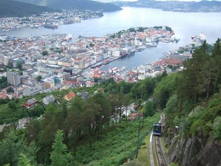 ベルゲンで楽しみにしてたのは、このケーブルカー(↓)。登りは景色を堪能しながら歩いて、下りだけ乗ってみました。急な感じを伝える写真を撮るのはなかなか難しいです。365日雨という屋久島みたいなこと言われてるベルゲンの街並みです。