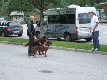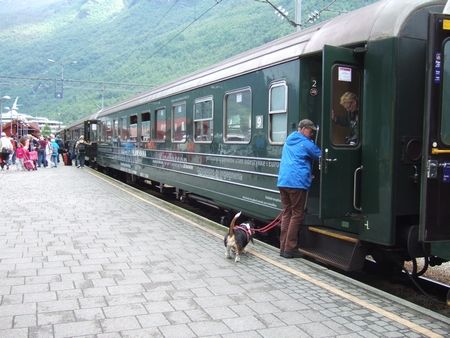 フロム鉄道にて。老夫婦が2匹の犬を連れて旅行していました(↓)。