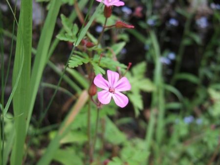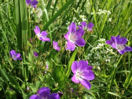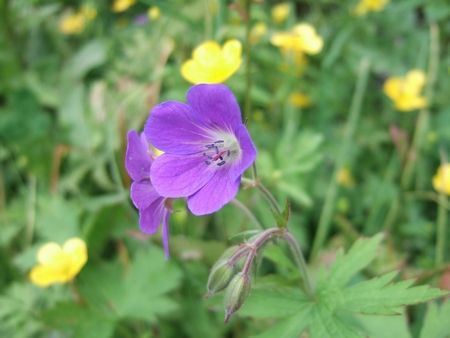 ここからは道端のお花畑から。紫の花、グンナイフウロかな!? バックの花の色が違うと、また印象が違うなぁと。続けて2枚どうぞ!キンロバイっぽい黄色いお花をバックに(↓)。