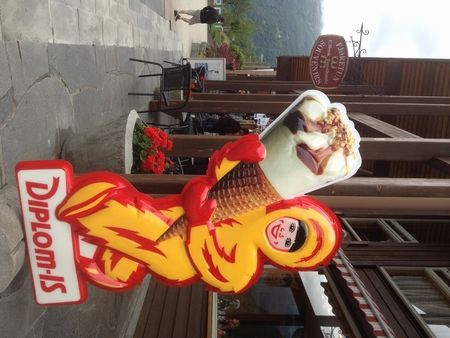 あとひとつ。こちらはアイスメーカーの看板(↓)。正直、この看板では食欲がわきませんでしたが、一度ソフトクリーム(Softis)を食べたらとりこになって、ほとんど毎日買っては夫と半分こしてました。ソフトなんだけど、横に倒しても落ちないくらいしまってました。