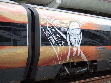 この電車を待つ間、隣のホームにはムンクデコの列車が入ってきました(↓)。おもいっきし叫んでました。ちょっと耳にはさんだところによると、ムンクが叫んだのは、一緒にいた友人が自分のもとを離れていったからだそう。たしかに、美術館では叫ぶ数年前には同じ場所に友人と3人でいる絵が展示されていました。当の叫ぶ絵も何枚もあって、教科書に載ってたのはどれだったのか分からなくなりました。