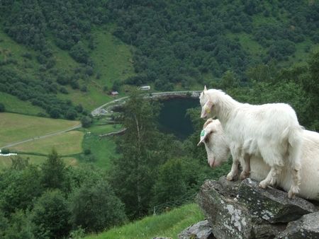 さて、遠くに見えた建物は、レストランとキャンプサイトのログハウス群でした。隣にはヤギが放牧されていました。こちらは親子でたそがれてました(↓)。そういえば、標高の低い場所は羊や馬が、標高の高いところや傾斜のきついところはヤギがいました。ヤギは小笠原とかたくさんの無人島で生き伸びているだけあって、たくましいですね。ちなみに、この国では羊のしっぽを切らないみたいで、日本でよくみた丸いのじゃなくて、なんだか不思議な感じがしました。