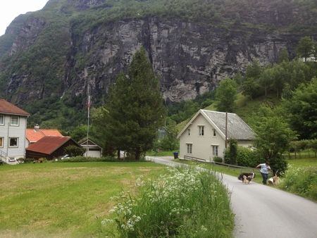 フィヨルドの岸辺にあたるガイランゲルの村内を歩くと、フィヨルドに注ぐ川がごうごうと流れていました(↓)。見た感じ、大人でも立っていられない勢いじゃないでしょうか。ノルウェーで印象的だったのはやはり滝の多さです。この時期(6月下旬)でも残る残雪の雪解け水とともに、毎日一度は降ってるんじゃないかという雨水とで、どの滝も川も迫力がありました。ラフティングをやるにはなかなか勇気がいりそうです。