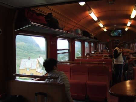その後、飛行機やバス、フェリーを経て乗ったのは、ラウマ鉄道(↓)。バスの運転手さんの機転でぎりぎりセーフで間に合って、走って乗り込みました。2両編成でかわいらしいと思いきや、車内は近代的な内装でした。間に合ってほっとしたのもあって、半分くらい寝てしまった(笑)