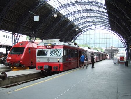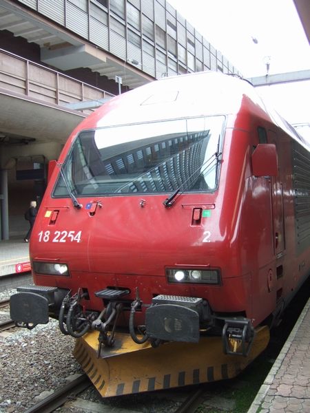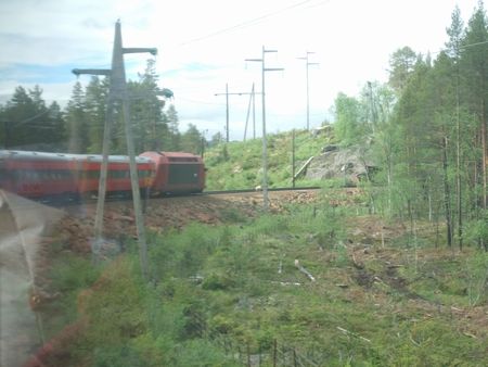 アンダルスネス(Andalsnes)駅からドンボス(Dombos)駅まで乗りました(指定席でした。この方向なら、進行方向に向かって左側の座席がお勧め)。2両のディーゼルカーで、きれいです。わたしたちはGeirangerフィヨルドからのローカルバスから乗り継ぎ、ドンボス駅で、トロンハイム行きの電車に乗り換えました。ドンボス駅からオスロ行きの電車も出ています。この駅の周りは、お店も何もないので、待合室でひたすら待つことになります。景色的には、逆ルートのドンボス→アンダルスネス→ガイランゲルフィヨルド方向の方が感動が大きいかなと思います。