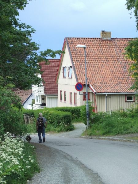 そして、急な坂道を下りていくと素敵な住宅地が。Old town地区だそうで、カラフルな三角屋根の家並みが。瓦屋根は何パターン(日本でよくみる瓦やサーモンのうろこを連想する丸い瓦など)かありました。壁と屋根と窓枠の色の組み合わせにも各家庭の個性が光っていました。そして、窓ガラスがきれいに磨かれていて、壁の色に映える色の花が咲いたハンギングバスケットが玄関先に吊るされていました。わたしは歩いているだけで楽しくって、滞在中、まさに練り歩きました~。坂が急なので、郵便やさんも歩いて回っていたのですが、何度も行き交ってちょっと気恥ずかしかった(笑)。お散歩してたわんことともに。