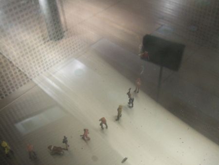 地下にいくと暗いトンネルだったので、ぎょっとしました。よく見ると、パネル展示場になっていまして、鮭の生態、酸性雨による数の減少(酸性雨が魚類に及ぼす影響)、寄生虫、他の魚(トラウト)との見分け方などが紹介されていました。(このセンターは川の脇に立っていて、そこから水路で水を引き込んでいて)トンネルの一番奥にある水槽が展示されていました。水槽は、写真左下のように設計されていて、上流側から川の水を引き込み、下流側へ流していました。その水路が左上の写真で、ダムの魚道みたいな設計になっていました。水槽の中にはトラウトが泳いでいて、底には稚魚もいました。水をひいている川が濁流で、ごうごうと音が響いていました。