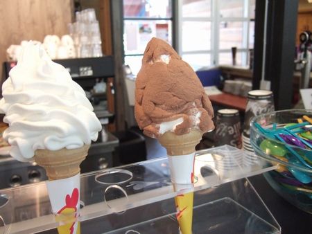 そして、看板編でも話題に出したソフティス(↓)。右のチョコフレーバーは、ソフティスを横倒しにしてぺたぺたつけてくれたもの。たくさん歩いて目的地に着くと、ソフティス看板を探すわたしたちでした。欲しくなるとちょうどあるという。商売うまいな(笑)