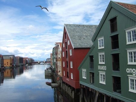 こちらは跳ね橋から河口方面の眺め(↓)。この地域はバックランネ(Bakklandet)という地区で、昔は労働者階級の人たちが住んでいたそうです。このカラフルな家は、川に木の柱を立てた上に建っていて、川の反対(道路)側からみると、屋根のひさしの下に手動!?のウインチのようなものがぶら下がっていました。今はレストランなどお店として使われているようでした。偶然写りこんだカモメとともに。