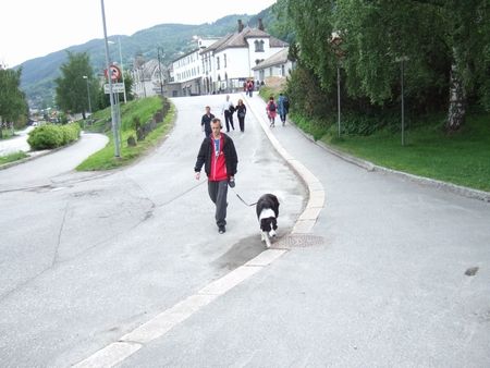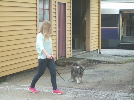 わんことお散歩する人(↓)。ベルゲン鉄道の途中駅にて。マルモの犬だ!