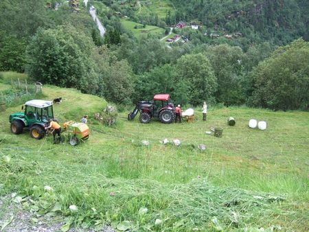 こちらも途中で出会った人々(↓)。おじいちゃん、おとうさん、子供の三世代の家族総出で、草刈りをしてまとめ、牧草をロール巻きにしていました。すごい傾斜(さきほどの道路看板よりは傾いてるから10度以上は余裕でありそうでした)。ここだけ開墾して平らにしたのかしら?草のロールも、よく見かけるサイズの1/4くらいでした。