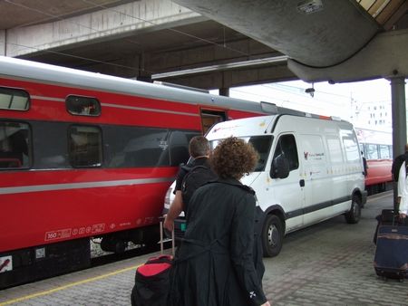 ベルゲン鉄道に戻ります。食べ物や飲み物は店舗のある車両に買いに行きます。商品の積みこみは、車で乗り付けてました(↓)。効率的^^;