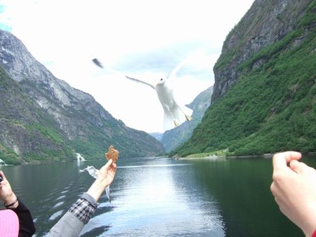なんだろうな~。フィヨルド観光の魅力はブログだと伝えにくいですね。。。静かな海を走るフェリーの甲板で、ちょっとひんやりする風に吹かれつつ、景色を眺めつつのんびりするのが楽しい、と私は思います。フェリーの甲板に立っているノルウェーの国旗が、そんな景色にすごくマッチしているなともいつも思います。
