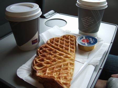 電車やフェリーでついつい食べたくなるのがワッフル(↓)やパンケーキ。パンケーキは、地方色があるみたいでチーズとジャムの2パターンを置いてるとこが多かったです。コーヒー好きなわたしたちはいつもコーヒーとともに頂きました。