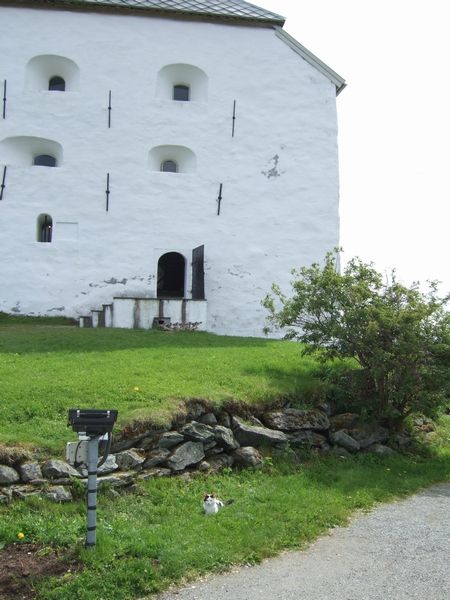 急な坂道をえっちらと登り、市民のお散歩コースとなっている風な林を通り抜けてやってきたこちらは、Kristiansten Fortress(↓)。真っ白い土壁の木造の建物ですが、中には大砲も置いてあって、かつでスウェーデン軍から街を守った要塞(とまで言っていいのか)でした。日本のお城と同じく市街を一望できる好立地にありました。そこにいた猫とともに。大きいので全部入らな~い(汗)