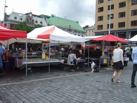 ベルゲンにて、魚市場でランチをする飼い主たち(↓)。テーブルの下にはもう一匹。