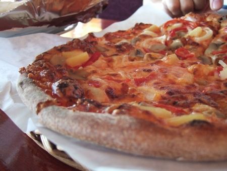 レストランに決めかねて、半ばあきらめかけて入ったケバブ屋さんのピザ(↓)。生地も手作り♪