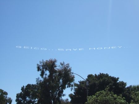 オマケ:空に浮かんだ某保険会社の広告。4機もの飛行機で煙を出して、空に文字を描いておりました。都会はかけるお金がちがうねーと。