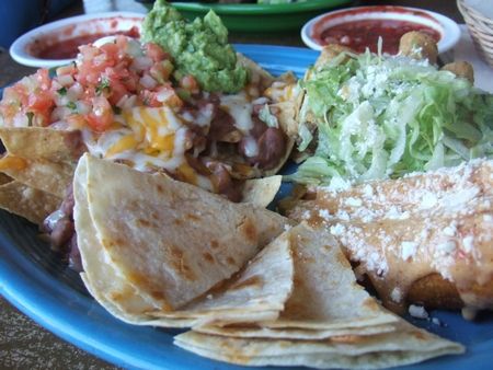 きましたー!トルティーヤを使ったサンプラープレート(↓)。写真ではうっすらしか見えてないのだが、チップスの上に乗った煮豆の味付けがめっちゃ好みでした。この前菜でお腹いっぱいになりました。夫もビールを堪能して嬉しそうでした。