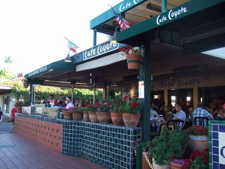 そして、お目当てのメキシカンレストランCafe Coyoteへ(↓)。店頭で、おばちゃん達がトルティーヤを手作りして焼いていました。ときどき家でも焼くので、生地の伸ばし方を二人して観察して勉強(笑)。