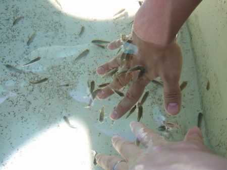 その後は、触れ合いコーナーで足を止め、魚に手のお掃除をしてもらいました。わたしの手(手前)はまずいらしく誰も寄ってこず(泣)、夫の手(黒い方)は犬だけじゃなく魚にも人気で羨ましい。