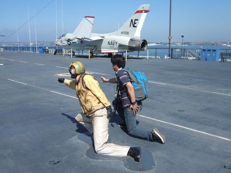 甲板の上には、歴代の戦闘機やヘリがずらりと並んでいました。こちらは甲板の上で、離発着の信号を出す人の像と夫(↓)。