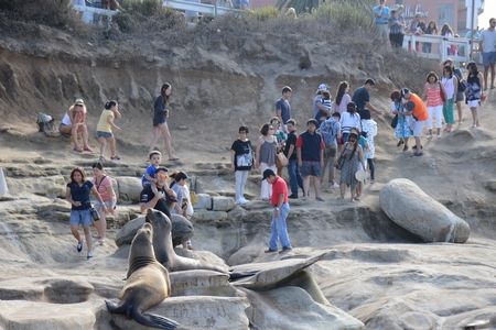 アシカのもとには、陸からだけじゃなく、海からも人がやってきます。アシカがいるところには、シュノーケリングとカヤックの群れがあるのでわかりやすい(↓)。