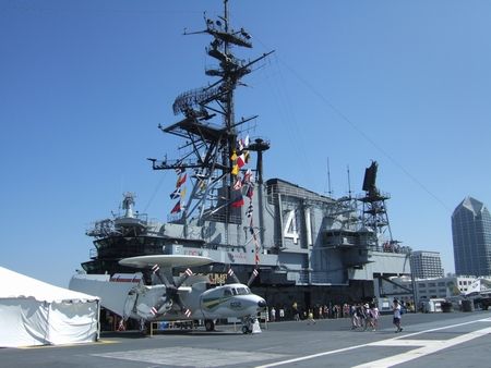 続いて、ミッドウェー博物館に入りました。この博物館は、ベトナム戦争や湾岸戦争に使った航空母艦そのものでした。写真は、飛行甲板の上から撮った司令官たちが入る施設とのこと(↓)。この中は、別途、ツアー料金を払わないと入れなかった。