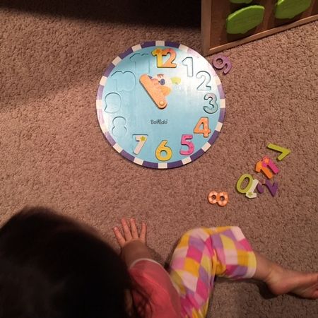 *数字に興味があるようで、以前からレンジで牛乳をチンするときに一緒にカウントダウンする日々。時計のパズルを渡したら、あんがいさらっとはめていってた。(写真)