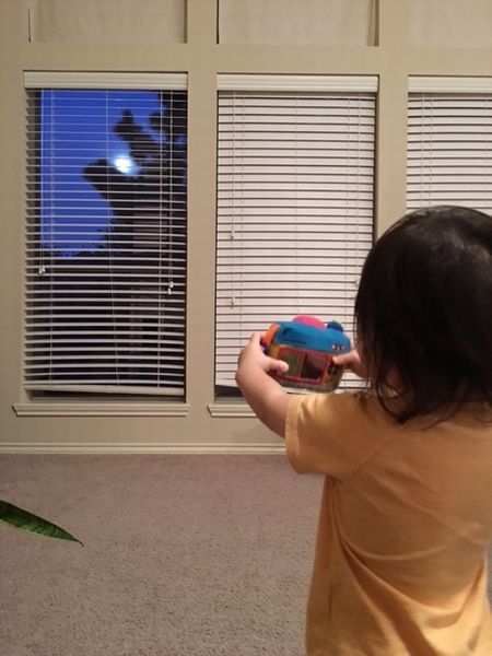 満月(に近い丸い月)が見えた夕方の散歩で、童謡の「つき」をうたったら大層気に入ったもよう。絵本に載っていた曲で聞き覚えがあるのと、着替えるときに夫が(腕が)「でた~!」と掛け声をかけていて、娘も言えるようになったのとなどがあるのかもしれない。「で~たぁ、でぇ~たぁ。。。。ま~るいま~るい。。。」と言いながら、円を描いていたのでした。家の前でも、近所に響き渡る大声で歌っていました。ようやく部屋に入って、部屋からも月を見えるのを発見すると、カメラの玩具をもってきて、シャッターを切って(音がでる)写真に収めようとしていたのでした。面白かった!
